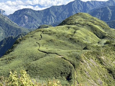 笹原の中に延びる登山道が女性の横顔に見えるのです。