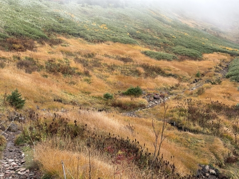 下の写真は、西吾妻山へと向かう途中から振り返る西大巓山頂と一面に広がる草紅葉。