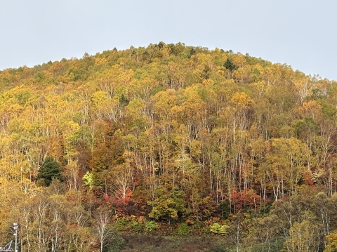 下の写真は、眼下に広がる志賀高原の紅葉と登山口付近で出逢った一面が黄色に染まる山。