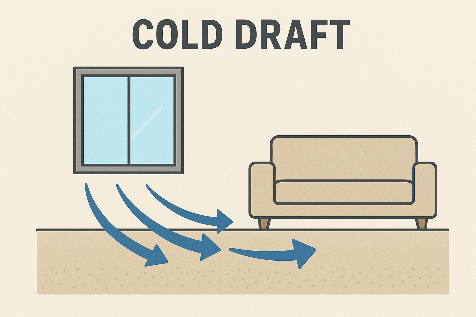 窓から入った冷たい空気は下にたまるので、暖房の暖かい空気が天井付近に滞留してしまっています。