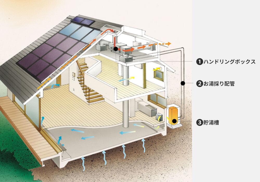 OMソーラーは、昼間の太陽熱を利用して暖かい空気をつくるシステムです。