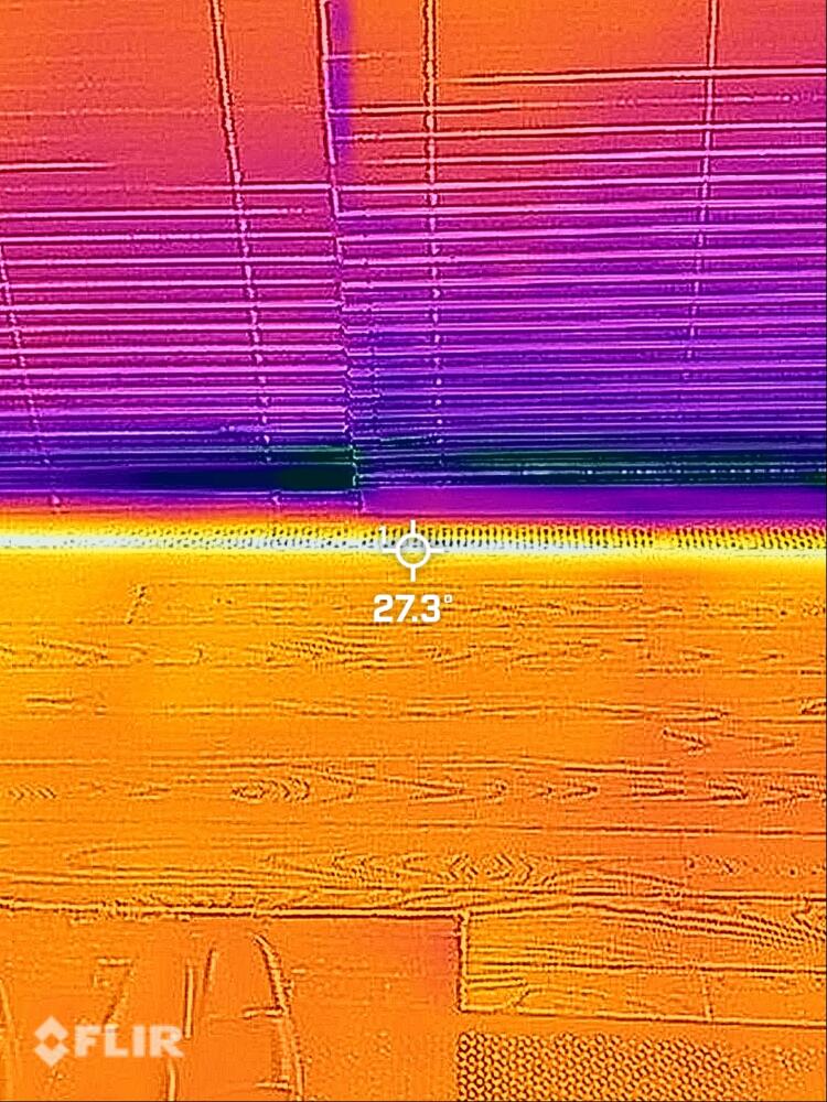 サーモグラフィーで温度を見てみると27℃・・・雪の日も家の中はぬくぬくです。