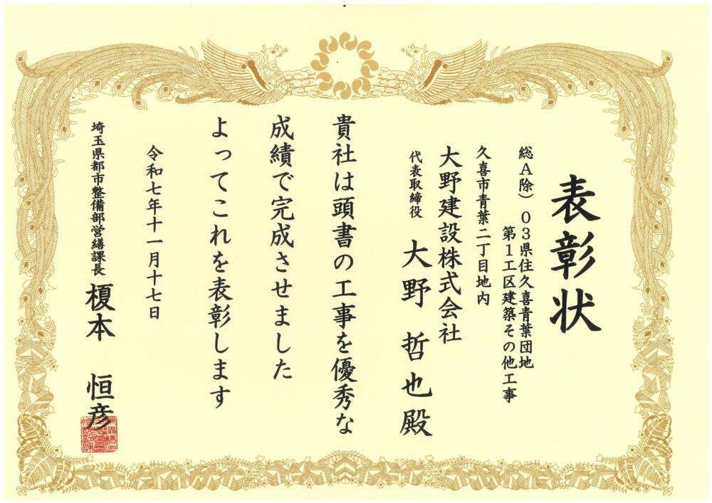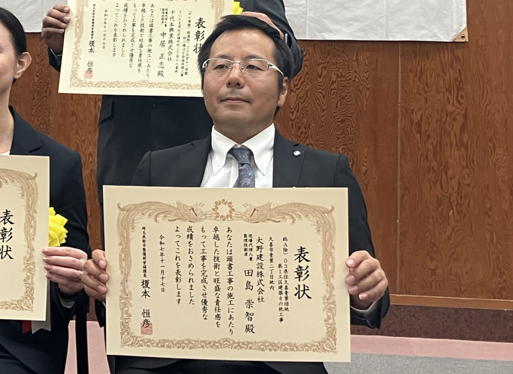 令和7年度「埼玉県県土づくり優秀建設工事施工者表彰 及び優秀現場代理人等表彰」にて、“優秀建設工事施工者表彰”を受賞、弊社工事部田島主任が“優秀現場代理人等表彰”を受賞しました。