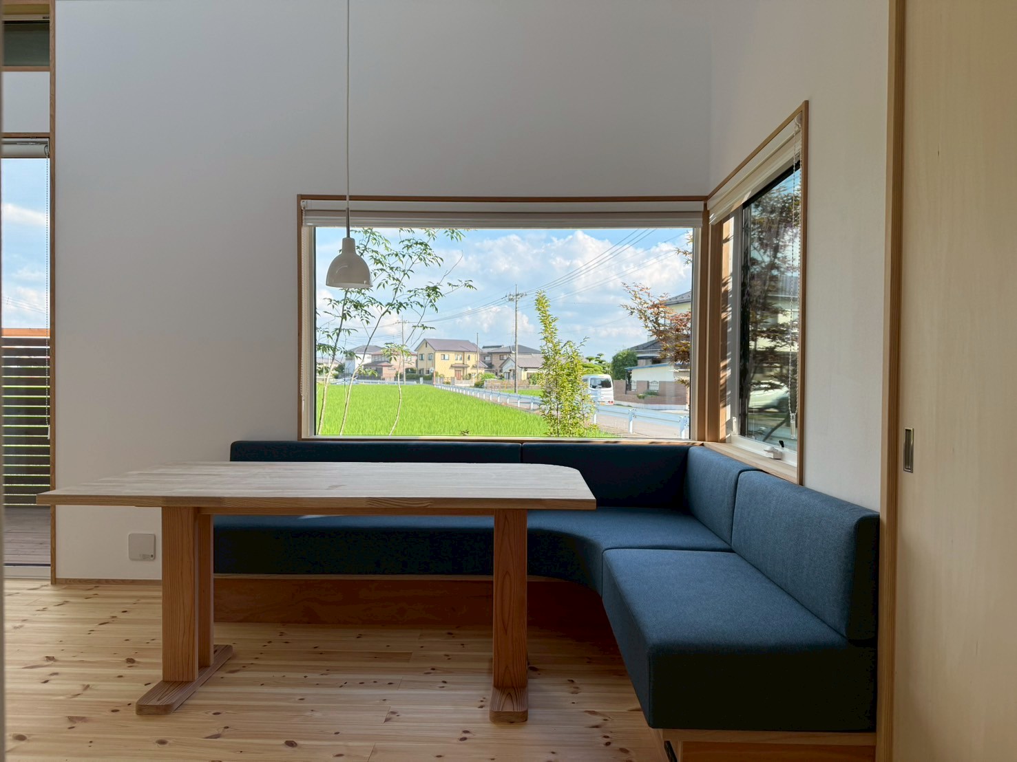 光に満ちた明るいリビングは、日々の暮らしの中で、ふと景色に目を向け、心がほどける時間を育みます。