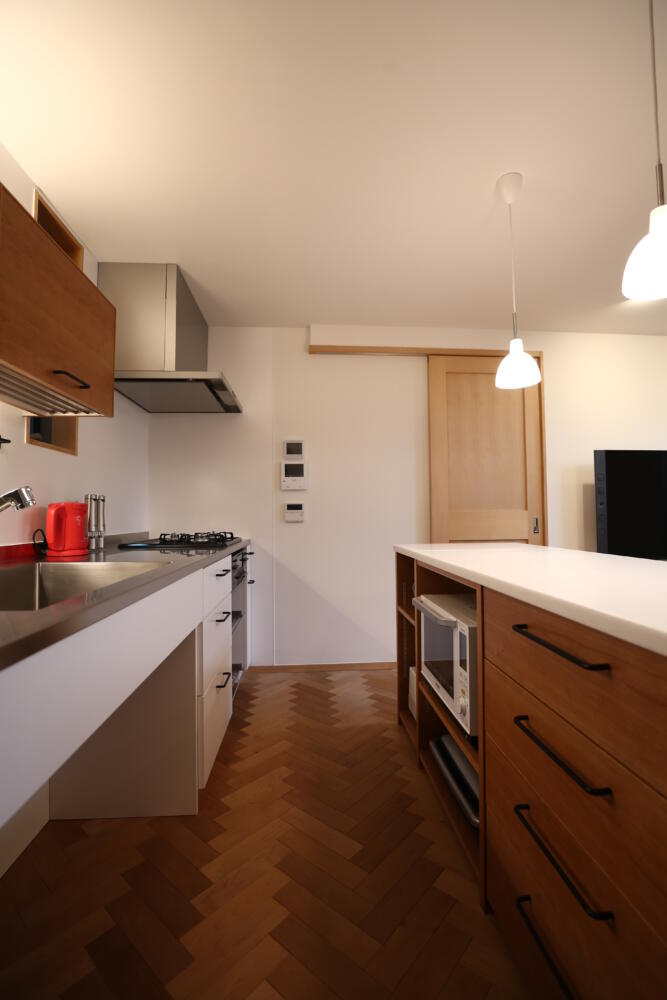 ヘリムボーン貼りの床と、チェリーで造作したキッチンカウンターが特徴。