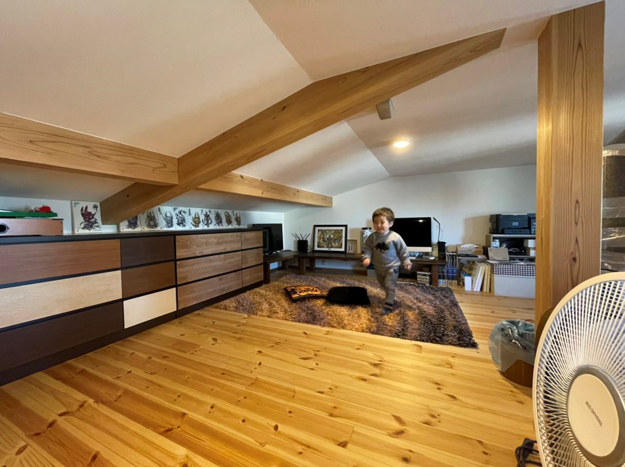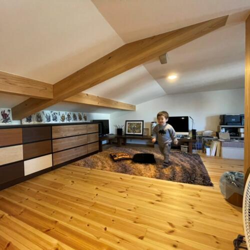 床面積が取れないので、収納としてフル活用しようとしっかりとした階段で上がれるようにした小屋裏は